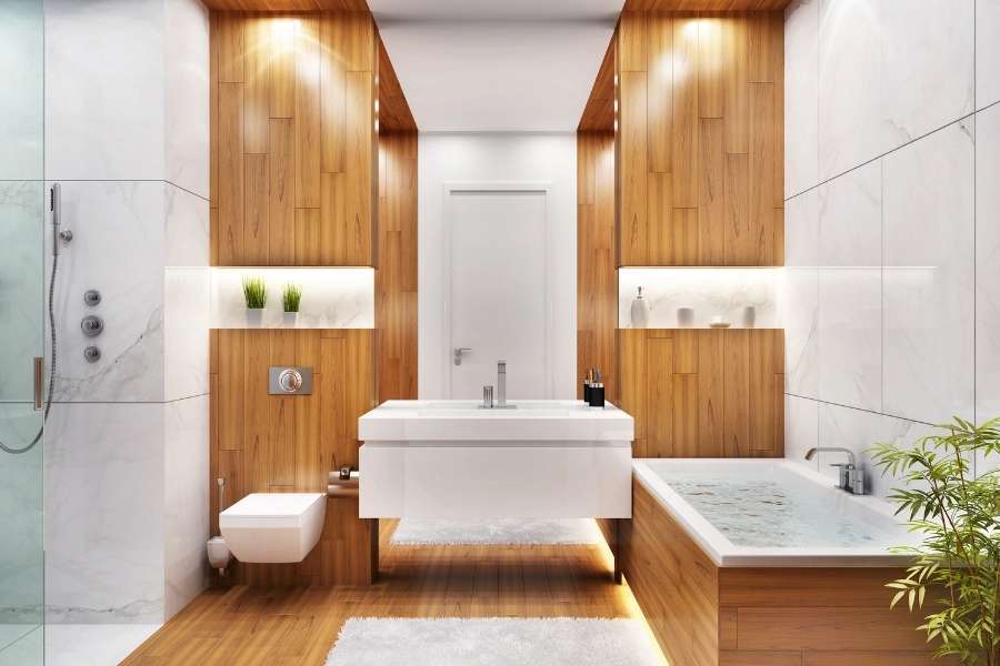 Privilégiez des tasseaux conçus pour les milieux très humides. L’usage d’un bois hydrofuge est fortement recommandé ici. Le bois aux murs améliore aussi l’acoustique de la pièce. Votre décoration de sa salle de bain devient plus apaisante.